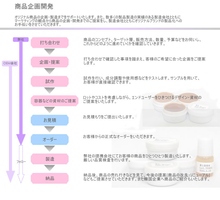 弊社では化粧品・健康食品のOEM委託製造している協力会社と提携し、エイジングケア商品の中心とした商品の企画提案を行っております。